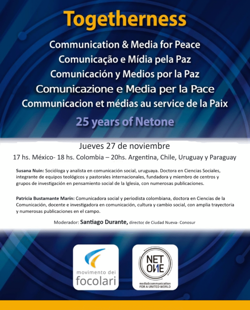 Con motivo de la publicación online de «Togheterness: Comunicación y Medios para la Paz» , celebraremos los 25 años del nacimiento de NetOne, red internacional de comunicadores. Los esperamos el Jueves 27 de noviembre., a las 17 hs. México- 18 hs. Colombia – 20hs. Argentina, Chile, Uruguay y Paraguay
