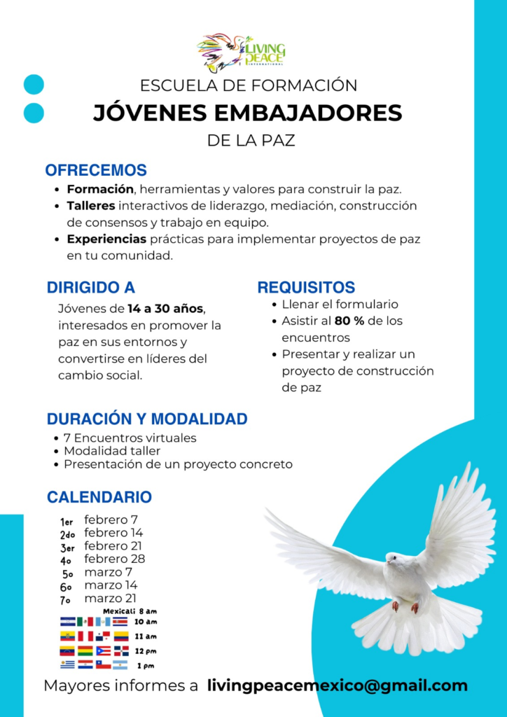 La Escuela de Formación Jóvenes Embajadores de la Paz, impulsada por el proyecto Living Peace International, es una plataforma educativa global diseñada para empoderar a las nuevas generaciones como agentes activos de cambio y convivencia armónica. A través de un enfoque basado en la «Pedagogía del Cuidado» y la metodología del «Dado de la Paz», esta escuela ofrece a jóvenes de diversos contextos culturales herramientas prácticas en liderazgo ético, resolución de conflictos y diálogo intercultural. Su objetivo principal es que cada participante no solo internalice los valores de la paz, sino que los traduzca en acciones sociales concretas y proyectos comunitarios, consolidando así una red mundial de líderes comprometidos con la dignidad humana y el bienestar colectivo.