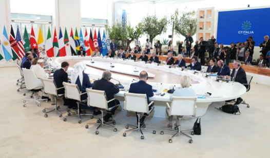 Tras saludar uno a uno a unos 24 jefes de Estado y de Gobierno -entre ellos Joe Biden (Estados Unidos), Javier Milei (Argentina) y Narendra Modi (India)-, el Papa ocupó su lugar en torno a la amplia mesa oval entre Giorgia Meloni y Emmanuel Macron.