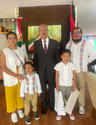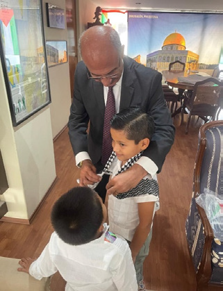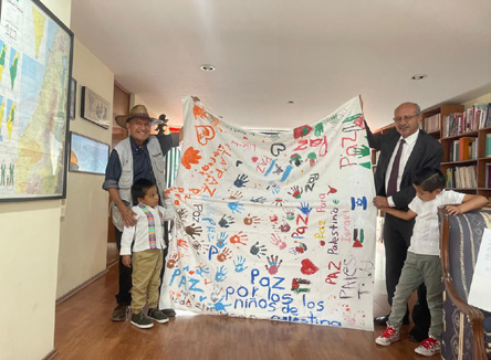 Ese encuentro se convirtió en un símbolo. Franco y Matías, en representación del grupo, pudieron ir a la embajada, acompañados por sus padres y mi persona. Fueron recibidos por el embajador palestino, quien los escuchó con atención, observó los dibujos plasmados en un gran pendón de tela; uno por uno y los bendijo con gratitud. Al final, les obsequió una cufiya, el tradicional pañuelo palestino, símbolo de resistencia y esperanza, que colocó con afecto sobre los hombros de los niños.