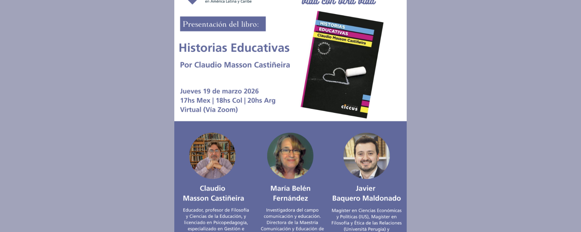 Desde el Instituto Universitario Sophia ALC tenemos el agrado de invitarles a la presentación del libro Historias educativas, de Claudio Masson Castiñeira.